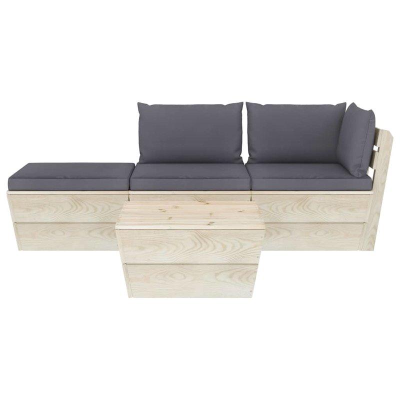 Diese 4-teilige Garten-Sofagarnitur aus Paletten mit Kissen ist eine ausgezeichnete Wahl, um sich zu entspannen und das Wetter zu genießen, ein Nickerchen zu machen oder mit Ihrer Familie oder Freunden zu plaudern. Mit seinem zeitlosen Palettendesign verleiht dieses Lounge-Set aus Holz Ihrer Terrasse, Ihrem Garten oder Ihrem Wohnzimmer einen Hauch von rustikalem Charme. Das Garten-Lounge-Set besteht aus imprägniertem Fichtenholz und ist somit langlebig und stabil. Diese Terrassen-Sofagarnitur verfügt über eine solide Konstruktion und ist wartungsarm. Mit seiner robusten Tischplatte bietet der Tisch den idealen Platz, um Snacks und Getränke griffbereit zu halten. Dank der Bezüge aus 100 % Polyester und der dicken Polsterung fühlen sich die Palettenauflagen weich an und bieten höchsten Komfort. Darüber hinaus ermöglicht Ihnen der modulare Aufbau, das Set in einer beliebigen Anordnung je nach Ihrem Geschmack aufzustellen. Bitte beachten Sie, dass Holz ein Naturprodukt ist und daher Unvollkommenheiten aufweisen kann.