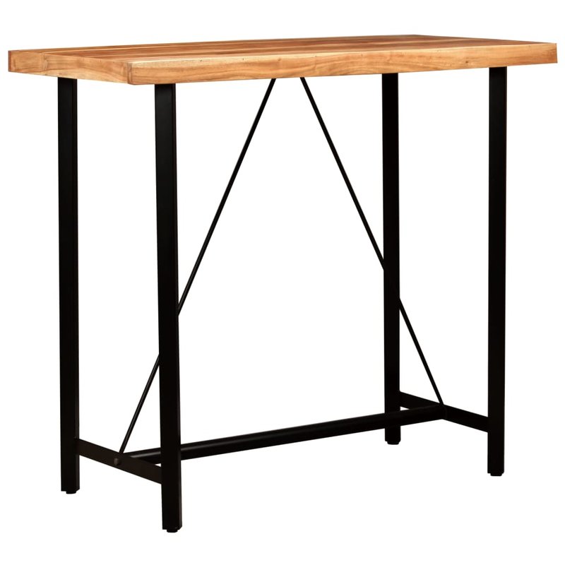 Dieses coole Bar-Set hat einen industriellen Look, das eine unverwechselbare Ergänzung für jedes Zuhause, jede Bar oder jedes Restaurant darstellt. Der Bartisch besteht aus massivem Palisanderholz. Palisander, auch bekannt als Rosenholz, ist ein tropisches Hartholz, das für seine reichhaltige Maserung berühmt ist. Die robusten Stahlbeine machen den Bartisch sehr robust und langlebig und tragen zu seinem spektakulären Industrie-Stil bei. Die perfekte Handwerkskunst garantiert, dass jeder Schritt des Fertigungsprozesses mit größter Sorgfalt ausgeführt wird, sei es Polieren oder Lackieren. Die Barstühle mit ikonischer Optik sind mit echtem Leder bezogen, das sich weich anfühlt und den Stuhl extrem langlebig macht. Die Polsterung sorgt für ein komfortables Sitzerlebnis, während die starken Eisenbeine für Stabilität und Haltbarkeit sorgen. Das Barset ist einfach zu montieren. Die Lieferung umfasst 1 Tisch und 4 Echtlederstühle. Wichtiger Hinweis: Holzmaserung und Farben variieren von Stück zu Stück und machen jedes Möbelstück einzigartig. Die Lieferung erfolgt nach dem Zufallsprinzip.
