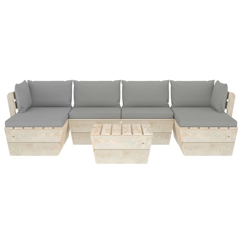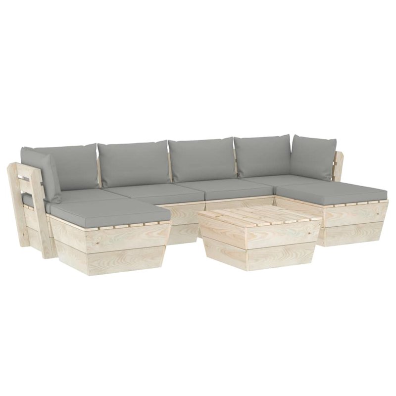 Diese 7-teilige Garten-Sofagarnitur aus Paletten mit Kissen ist eine ausgezeichnete Wahl, um sich zu entspannen und das Wetter zu genießen, ein Nickerchen zu machen oder mit Ihrer Familie oder Freunden zu plaudern. Mit seinem zeitlosen Palettendesign verleiht dieses Lounge-Set aus Holz Ihrer Terrasse, Ihrem Garten oder Ihrem Wohnzimmer einen Hauch von rustikalem Charme. Das Garten-Lounge-Set besteht aus imprägniertem Fichtenholz und ist somit langlebig und stabil. Diese Terrassen-Sofagarnitur verfügt über eine solide Konstruktion und ist wartungsarm. Mit seiner robusten Tischplatte bietet der Tisch den idealen Platz, um Snacks und Getränke griffbereit zu halten. Dank der Bezüge aus 100 % Polyester und der dicken Polsterung fühlen sich die Palettenauflagen weich an und bieten höchsten Komfort. Darüber hinaus ermöglicht Ihnen der modulare Aufbau, das Set in einer beliebigen Anordnung je nach Ihrem Geschmack aufzustellen. Bitte beachten Sie, dass Holz ein Naturprodukt ist und daher Unvollkommenheiten aufweisen kann.