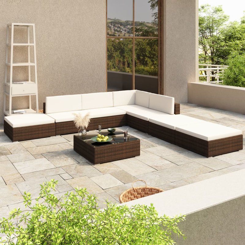 Diese Loungegruppe aus Poly-Rattan vereint Stil und Funktionalität und wird zum echten Hingucker in Ihrem Garten oder auf der Terrasse. Sie kann das ganze Jahr über im Außenbereich verwendet werden. Die Loungegruppe ist aus witterungsbeständigem, hochwertigem PE-Rattan gefertigt; sie ist demnach strapazierfähig genug, um zu allen Jahreszeiten von der ganzen Familie verwendet zu werden. Sie ist außerdem beständig gegen UV-Licht, Chlor und Salzwasser und hat einen stabilen, pulverbeschichteten Stahlrahmen und rostfreie Kunststoff-Füße. Dank der Leichtbau-Konstruktion ist das Set auch einfach zu verstellen. Die dick-gepolsterten, abnehmbaren Sitz- und Rückenpolster sind sehr komfortabel. Die pflegeleichten Polyesterbezüge mit verdeckten Reißverschlüssen können auch abgenommen und gewaschen werden. Die Rattan-Sitzgruppe lässt sich flexibel umstellen und so jeder Umgebung anpassen. Lieferumfang: 1 x Eckteil, 3 x Sitze ohne Armlehnen, 3 x Hocker, 1 x Couchtisch mit Glasplatte, 7 x Sitzkissen und 5 x Rückenkissen. Hinweis: Wir empfehlen, das Set bei Regen, Schnee oder Frost abzudecken.