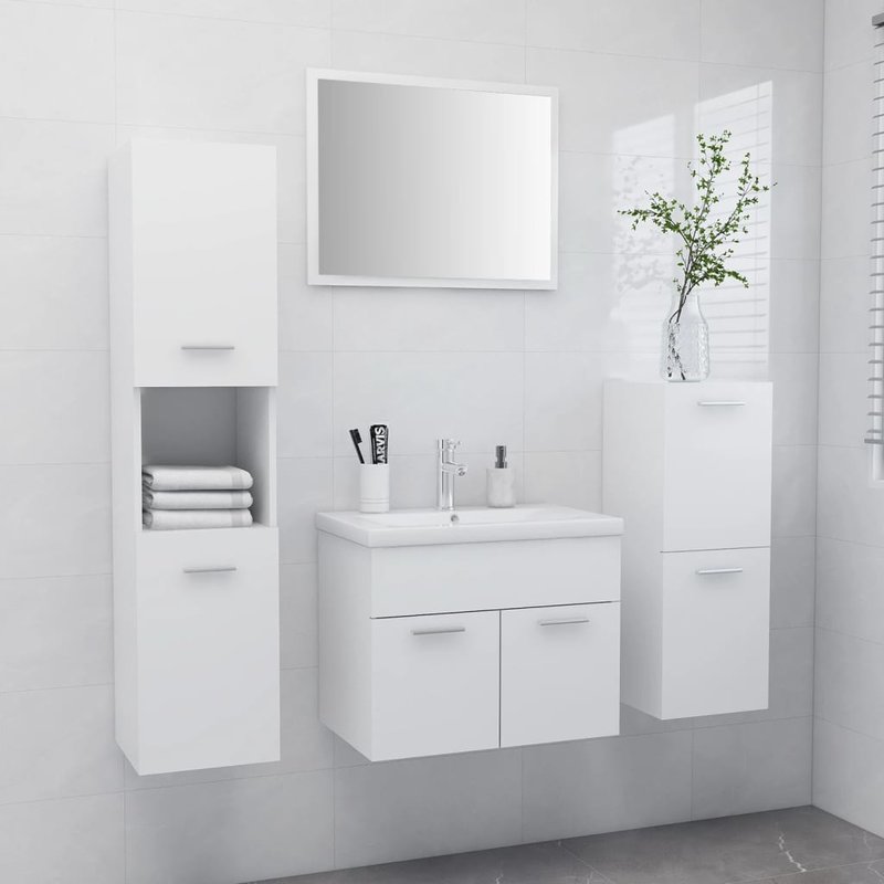 Mit diesem stilvollen Badmöbel-Set können Sie zusätzlichen Stauraum im Ihrem Badezimmer schaffen. Die klaren Linien und das schlanke Design fügen sich perfekt in jedes Badezimmer ein. Das Möbelset besteht aus einem Waschbeckenunterschrank, einem Midischrank, einem Hochschrank, einem Einbaubecken und einem Spiegel. Der schicke Waschtischunterschrank mit 1 Fach bietet den idealen Platz für das Waschbecken. Der Hochschrank verfügt über 5 Fächer und 2 Türen, während der Midischrank mit 2 Fächern versehen ist. Diese 2 Schränke bieten verschiedene Aufbewahrungsmöglichkeiten und zusätzlichen Stauraum in Ihrem Badezimmer. Aus Keramik gefertigt, dient das Becken nicht nur als täglicher Gebrauchsgegenstand, sondern auch als Ornament in Ihrem Wohnbereich. Dank seines zukunftsweisenden und zeitgemäßen Designs passt dieser Waschtisch definitiv in jede Einrichtung. Zudem ermöglicht der Überlauf das Abfließen des Wassers, wenn das Becken zu voll wird. Der Spiegel macht auch eine gute Figur in Ihrer Inneneinrichtung. Darüber hinaus lässt sich das Badmöbel-Set mit einem feuchten Tuch ganz einfach reinigen. Achtung: Der Wasserhahn und die Push-Open-Ablaufgarnitur mit Überlauf sind im Lieferumfang enthalten.