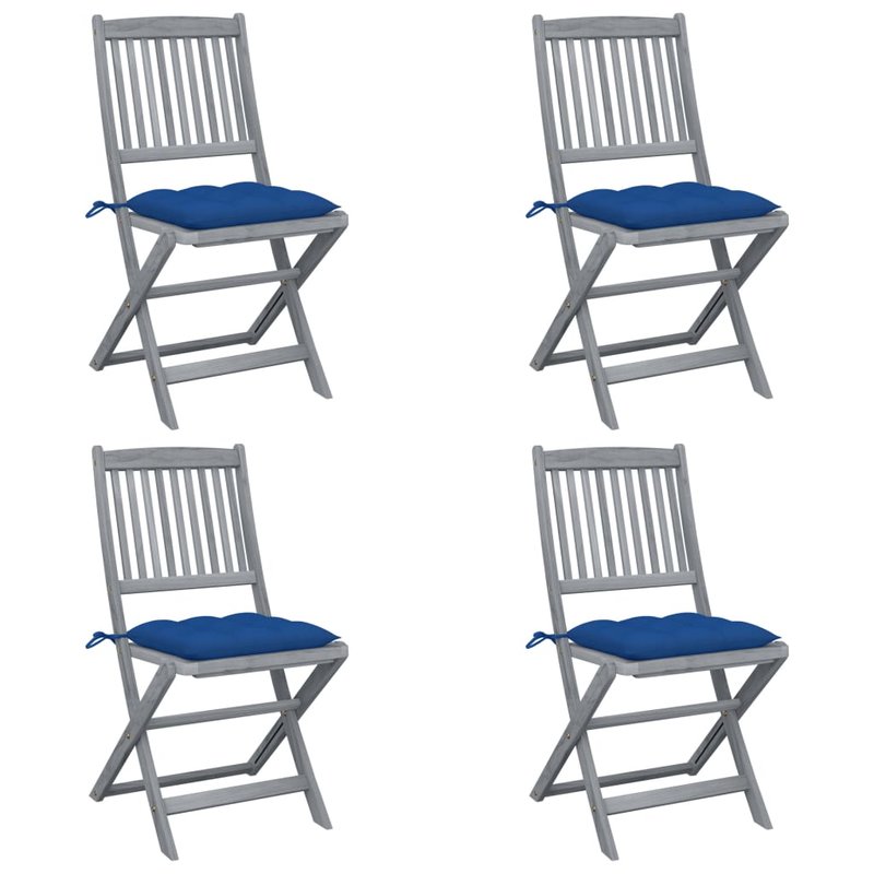 Dieses moderne Set aus Holz-Gartenstühlen mit Sitzpolstern verleiht Ihrem Garten, Ihrer Terrasse oder Ihrem Hof einen Hauch von natürlichem Stil und ist außerdem eine ausgezeichnete Wahl für Mahlzeiten im Freien. Diese Essstühle bestehen aus massivem Akazienholz, einem tropischen Hartholz, was die Stühle witterungsbeständig macht und eine jahrelange Lebensdauer gewährleistet, da massives Akazienholz sowohl belastbar als auch verschleißfest ist. Die grau lasierte Oberfläche ist ganz einfach mit einem feuchten Tuch zu reinigen. Bei Nichtgebrauch lassen sich die Stühle platzsparend zusammenklappen. Darüber hinaus bieten die mitgelieferten Sitzkissen zusätzlichen Komfort beim Entspannen oder Speisen. Zur sicheren Befestigung am Stuhl ist jedes Sitzpolster mit je zwei Bindebändern an zwei Ecken versehen.