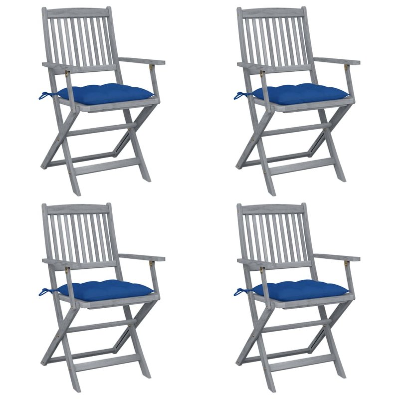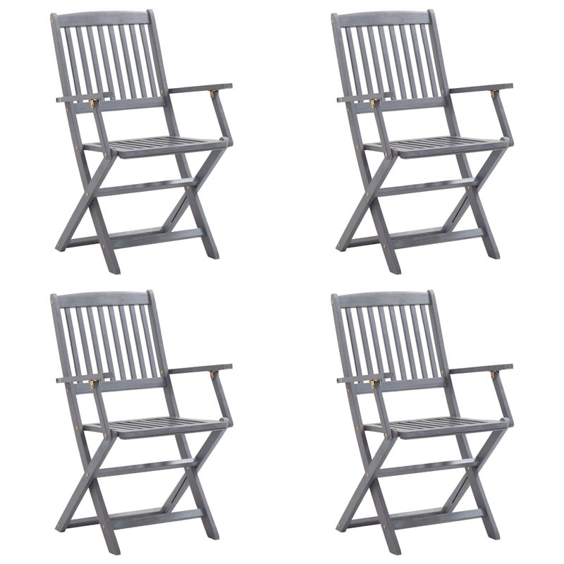 Dieses moderne Set aus Holz-Gartenstühlen mit Sitzpolstern verleiht Ihrem Garten, Ihrer Terrasse oder Ihrem Hof einen Hauch von natürlichem Stil und ist außerdem eine ausgezeichnete Wahl für Mahlzeiten im Freien. Diese Essstühle bestehen aus massivem Akazienholz, einem tropischen Hartholz, was die Stühle witterungsbeständig macht und eine jahrelange Lebensdauer gewährleistet, da massives Akazienholz sowohl belastbar als auch verschleißfest ist. Die grau lasierte Oberfläche ist ganz einfach mit einem feuchten Tuch zu reinigen. Bei Nichtgebrauch lassen sich die Stühle platzsparend zusammenklappen. Darüber hinaus bieten die mitgelieferten Sitzkissen zusätzlichen Komfort beim Entspannen oder Speisen. Zur sicheren Befestigung am Stuhl ist jedes Sitzpolster mit je zwei Bindebändern an zwei Ecken versehen.