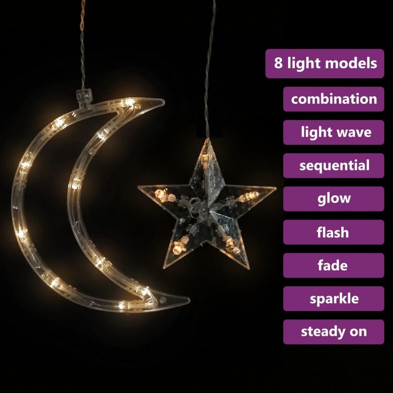 Die Lichterkette in Form von Sternen und Mond ist eine perfekte Ergänzung zu jedem Dekorationsprojekt. Sie eignet sich für Weihnachten, Partys, Hochzeiten und andere Feiertage. Der Lichtervorhang ist mit 138 energiesparenden LEDs ausgestattet, die eine magische Lichtleistung erzeugen. Er verfügt über 8 verschiedene Lichteffekte: Kombinationsmodus, Wellen, Sequenzmodus, langsam leuchtend, blinkend, langsame Ausblendung, Funkeln und kontinuierliche Beleuchtung. Mit der mitgelieferten Fernbedienung lassen sich die Beleuchtungsmodi einfach und bequem einstellen. Dies ist ein großartiges dekoratives Accessoire zur Beleuchtung von Innen- und Außenbereichen. Hinweis: Der mitgelieferte USB ist nicht wasserdicht, daher muss dieses Teil vor Wasser geschützt werden, aber dank des 3 m langen Kabels kann die Weihnachtsdekoration im Freien verwendet werden, da Kabel und Produkt wasserdicht sind.