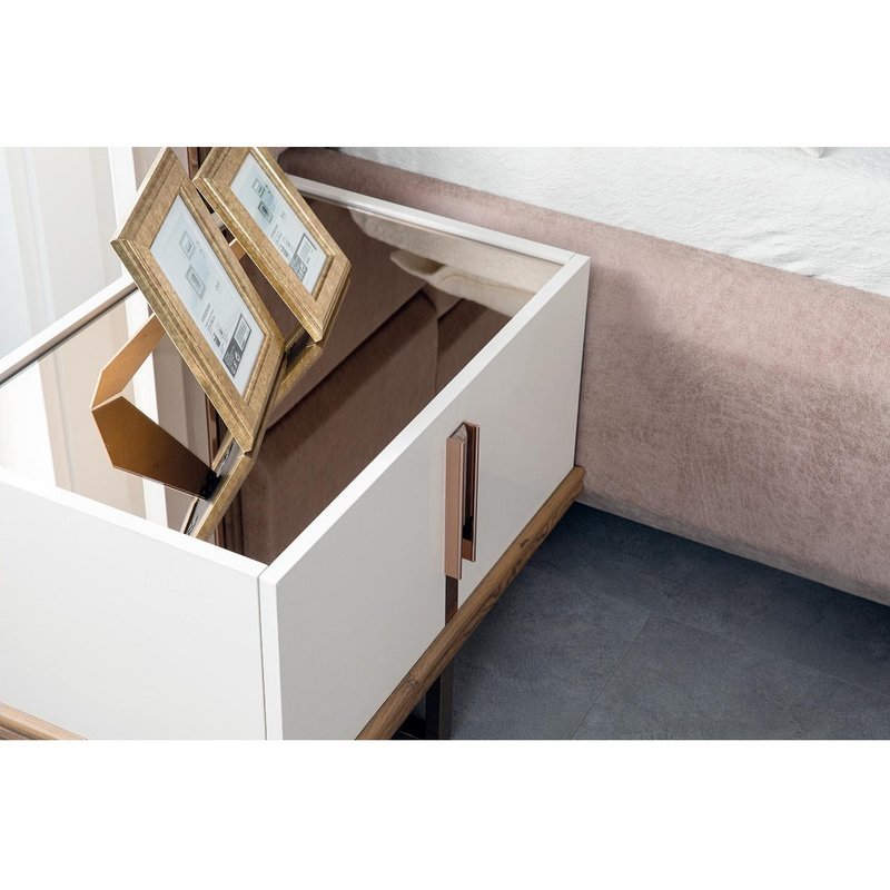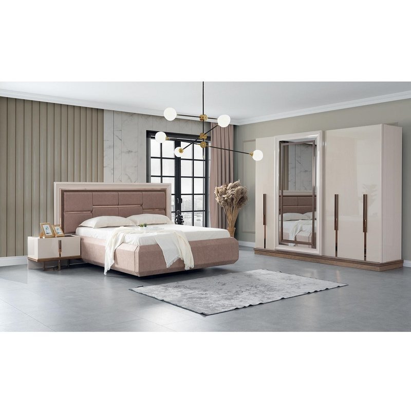 • Das Set besteht aus einem Bettkasten, einem Kopfteil, 2 Nachtkommoden, einem Kleiderschrank und einem Schminktisch mit Spiegel