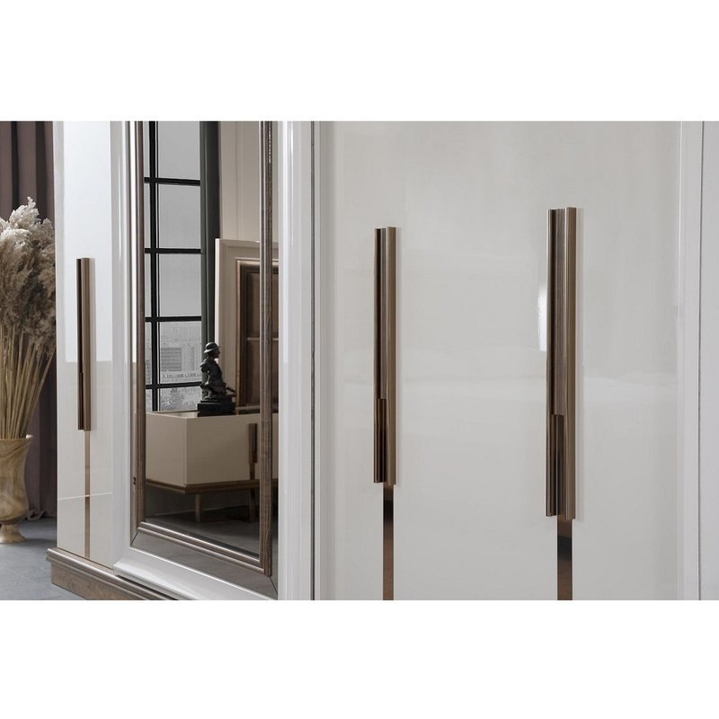 • Das Set besteht aus einem Bettkasten, einem Kopfteil, 2 Nachtkommoden, einem Kleiderschrank und einem Schminktisch mit Spiegel