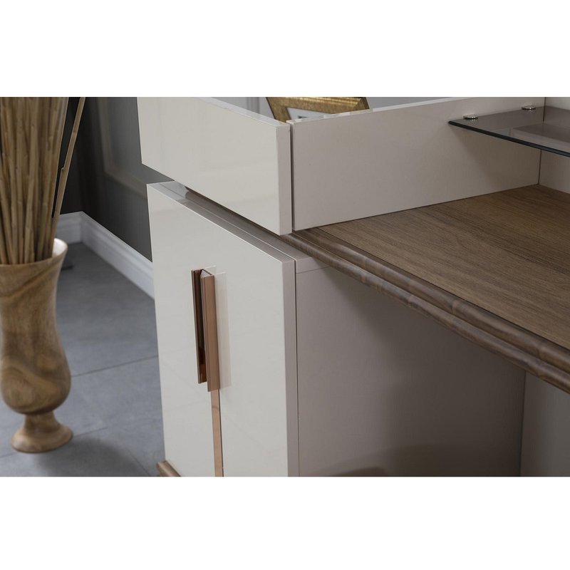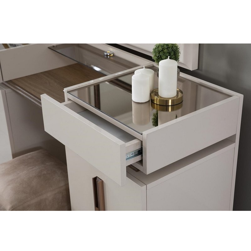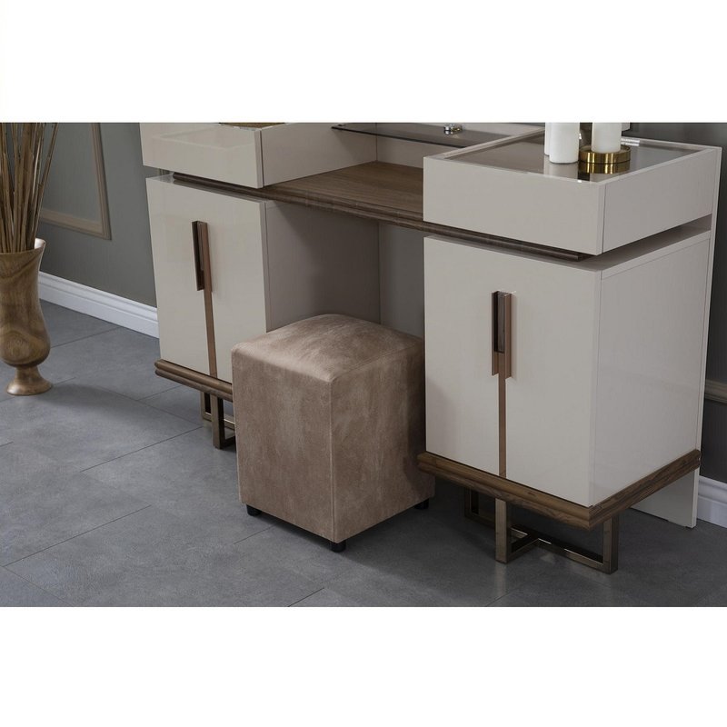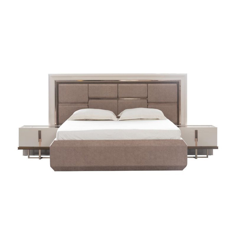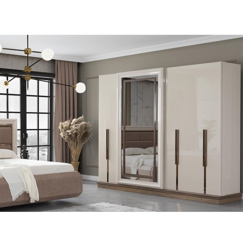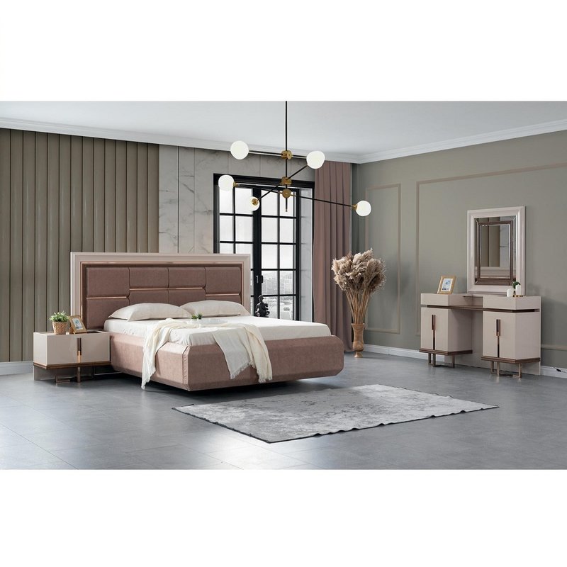 - Das Set besteht aus einem Bettkasten, einem Kopfteil, 2 Nachtkommoden, einem Kleiderschrank und einem Schminktisch mit Spiegel