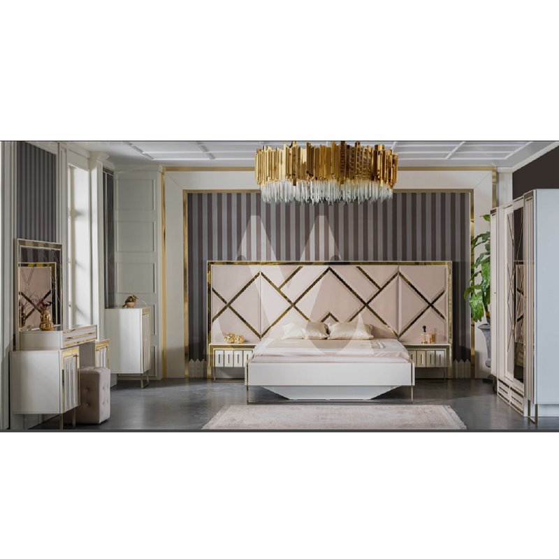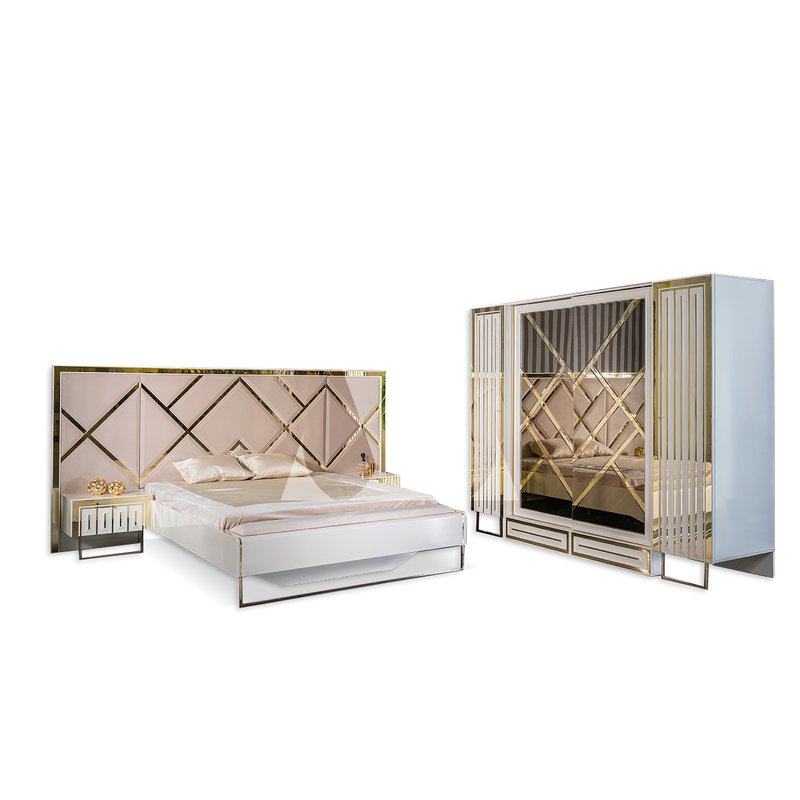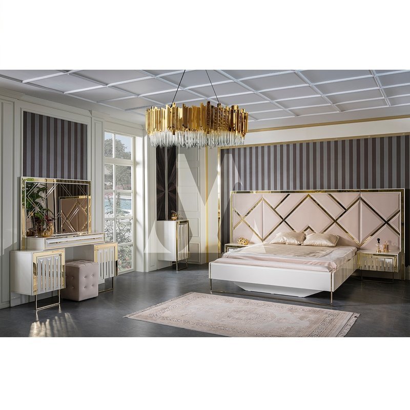 • Das Set besteht aus einem Bettkasten, einem Kopfteil, 2 Nachtkommoden, einem Kleiderschrank und einem Schminktisch mit Spiegel
