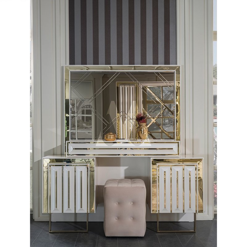 • Das Set besteht aus einem Bettkasten, einem Kopfteil, 2 Nachtkommoden, einem Kleiderschrank und einem Schminktisch mit Spiegel