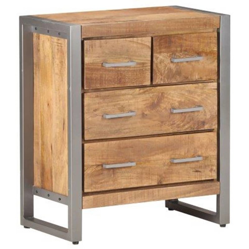 Dieses Holz-Sideboard verleiht Ihrem Wohnzimmer einen industriellen Stil. Der Beistellschrank besteht aus rauem Mangoholz, einem tropischen Hartholz, das belastbar und verschleißfest ist; somit ist das Sideboard stabil und langlebig. Der Eisenrahmen sorgt für zusätzliche Stabilität. Dieser Schrank verfügt über vier Schubladen, die viel Stauraum bieten. Darüber hinaus eignet sich das robuste Oberteil ideal für die Präsentation von Dekorationsobjekten wie Fotorahmen, Topfpflanzen, Vasen usw. Wichtiger Hinweis: Farbe und Maserung variieren von Stück zu Stück, so dass jedes Möbelstück einzigartig ist. Die Lieferung erfolgt nach dem Zufallsprinzip.
