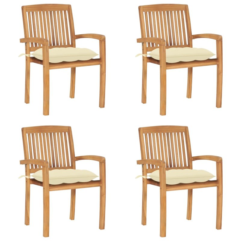 Verleihen Sie Ihrem Esszimmer, Garten oder Ihrer Terrasse einen Hauch von rustikalem Charme mit diesem stapelbaren Gartenstuhl-Set aus Holz! Das Essstuhl-Set verleiht Ihrem Innen- oder Außenbereich mit seinem eleganten Design einen Hauch von Eleganz. Dieses Teakholz-Möbel besteht aus extrem haltbarem Teakholz, das abgelagert, künstlich getrocknet und fein geschliffen worden ist, um ein sehr glattes Aussehen zu erzielen. Teak wird für seine außergewöhnliche Festigkeit und Witterungsbeständigkeit geschätzt, wodurch es sich weitaus besser als jede andere Holzart für Gartenmöbel eignet. Teak ist die perfekte Wahl, wenn Sie ein langlebiges Gartenmöbel kaufen möchten. Es ist leicht zu pflegen und mit einem feuchten Tuch zu reinigen. Außerdem kann der Esszimmerstuhl gestapelt werden, um bei Nichtgebrauch Stauraum zu sparen. Darüber hinaus sorgen die mitgelieferten Kissen für zusätzlichen Komfort. Jedes Kissen hat 2 Sätze Bänder, um es fest am Stuhl zu befestigen. Hinweis: Um die Lebensdauer Ihrer Gartenmöbel zu verlängern, empfehlen wir Ihnen, diese regelmäßig zu reinigen und bei Nichtgebrauch im Freien abzudecken.Reinigung: Verwenden Sie eine milde SeifenlösungLagerung: Wenn möglich, an einem kühlen, trockenen Ort im Innenbereich lagern. Wenn das Produkt im Freien gelagert wird, schützen Sie es mit einer wasserdichten Abdeckung. Wischen und trocknen Sie das überschüssige Wasser oder den Schnee nach Regen oder Schneefall von der ebenen Fläche. Sorgen Sie für eine ausreichende Luftzirkulation, um feuchtigkeitsbedingte Schäden zu vermeiden.
